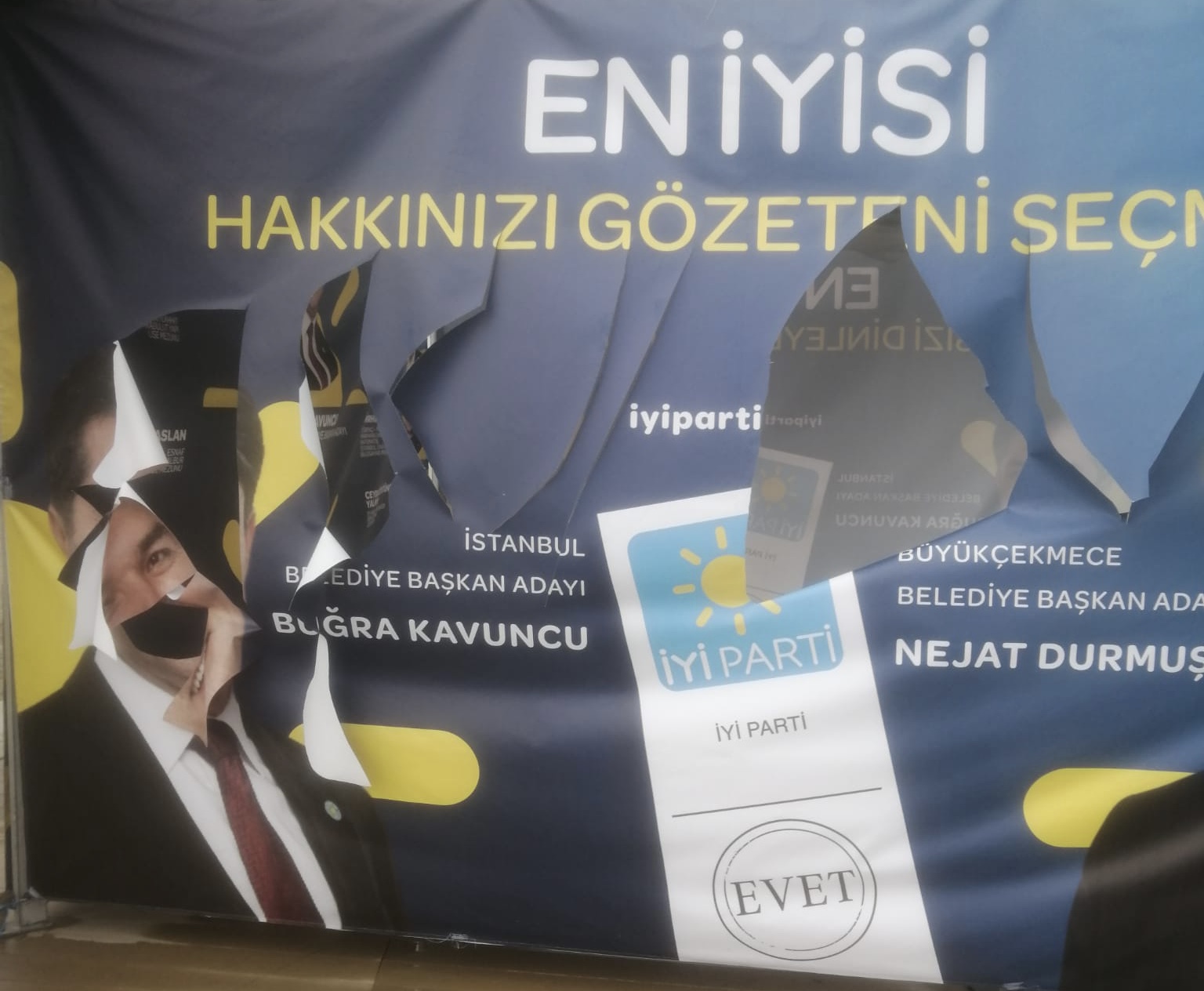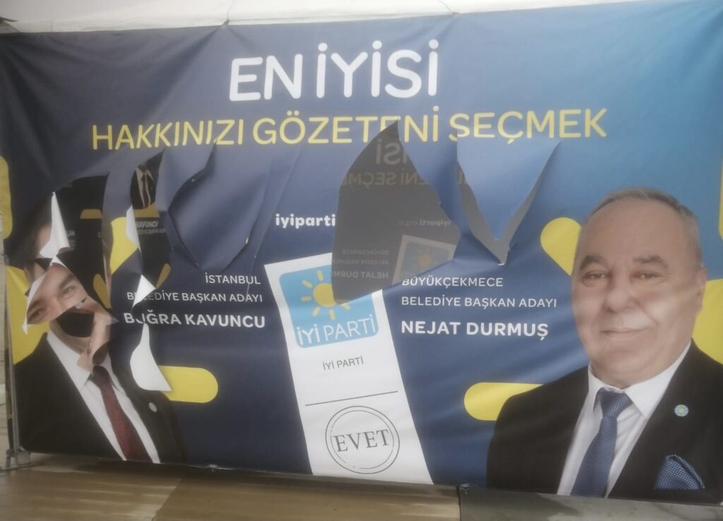 Çadır tahrip edildi ve İBB adayı Buğra Kavuncu ile Büyükçekmece adayı Nejat Durmuş’un posterleri yırtıldı.