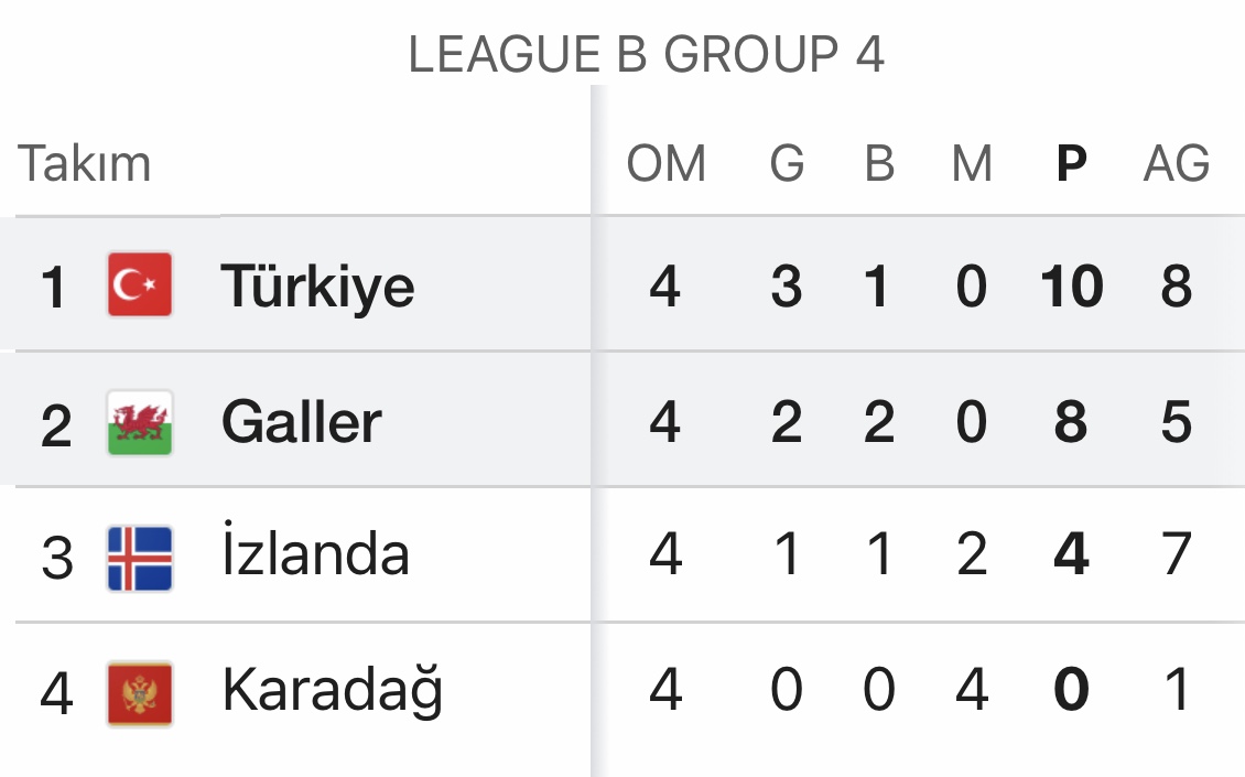 Galler ise 8. puanla 2. sırada yer alıyor.