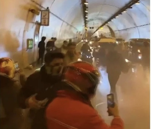 Tünelin ortasında araçlarından inen grup, meşale yakıp eğlendi.