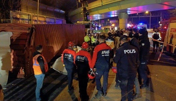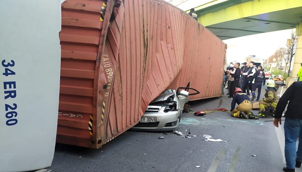 İstanbul – Bakırköy‘de üst geçide çarpan TIR, otomobilin üzerine devrildi.