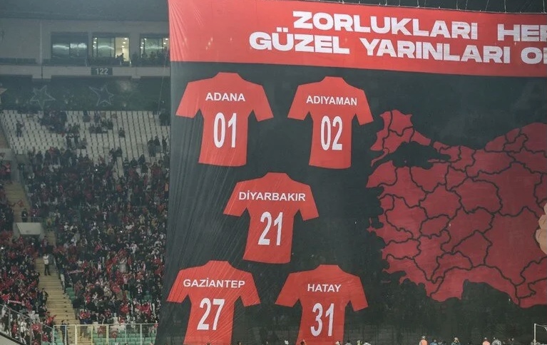 Güzel yarınları omuz omuza kuracağız.” yazısı ile depremden etkilenen illerin plaka numaralardan yazılı olduğu mili takım formalarının yer aldığı dev görsel açıldı.