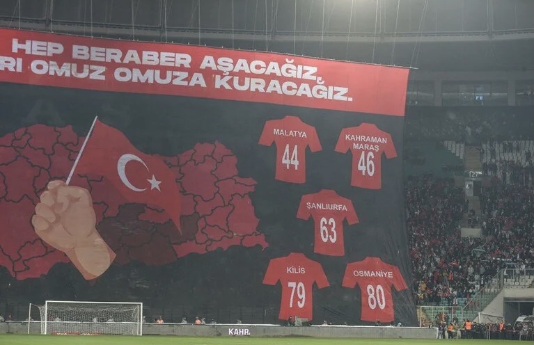 Tribünleri dolduran yaklaşık 40 bin seyirci kale arkası tribününde Türkiye haritası üzerinde “Zorlukları hep beraber aşacağız.