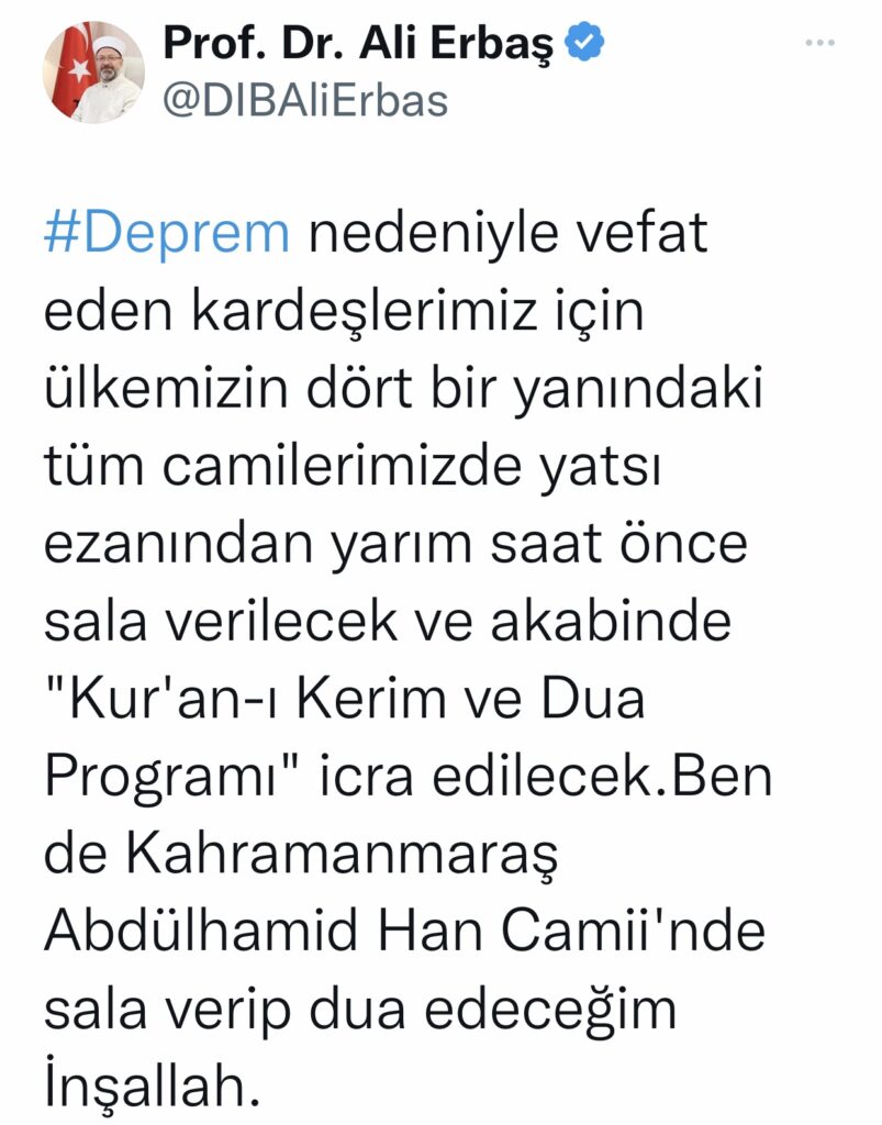 Erbaş, sosyal medya hesabından, “Deprem nedeniyle vefat eden kardeşlerimiz için ülkemizin dört bir yanındaki tüm camilerimizde, yatsı ezanından yarım saat önce sala verilecek ve akabinde Kur’an-ı Kerim ve Dua Programı icra edilecek.