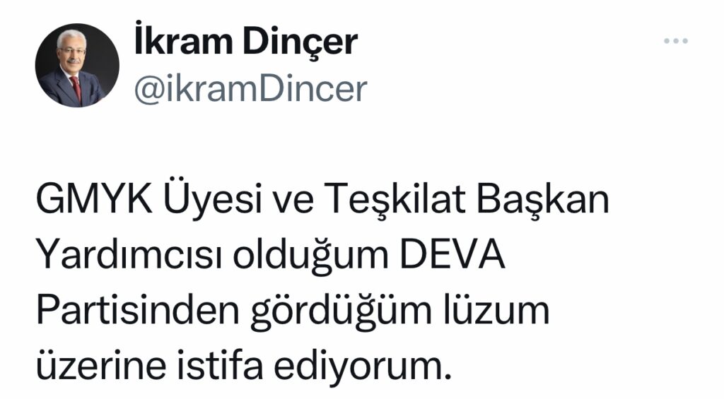 Deva Partisi‘nin kurucu üyelerinden (GMYK) İkram Dinçer, sosyal medya hesabından yaptığı açıklamada partisinden istifa ettiğini duyurdu. Dinçer, ”GMYK Üyesi ve Teşkilat Başkan Yardımcısı olduğum DEVA Partisi’nden gördüğüm lüzum üzerine istifa ediyorum.