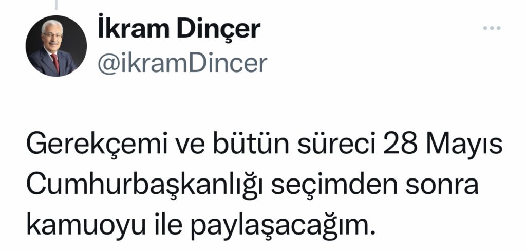 Gerekçemi ve bütün süreci 28 Mayıs Cumhurbaşkanlığı seçimden sonra kamuoyu ile paylaşacağım” ifadelerini kullandı