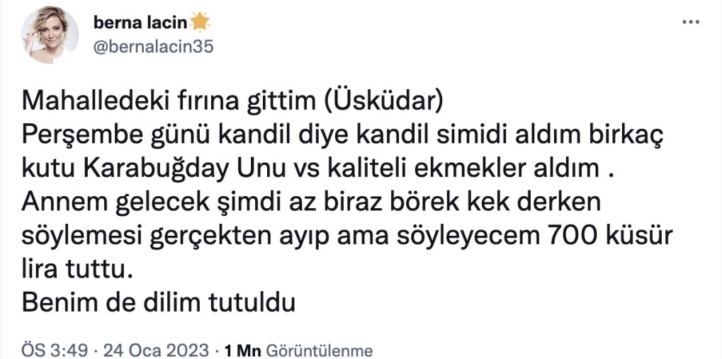 Oyuncu Berna Laçin, Üsküdar’daki bir fırından aldıklarının 700 lira tuttuğunu belirterek, “dilim tutuldu” dedi.