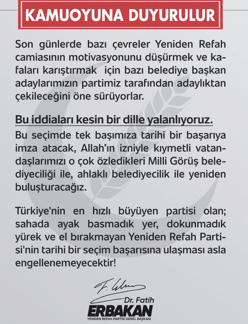 Konuyla ilgili bugün Yeniden Refah Partisi Genel Başkanı Fatih Erbakan, sosyal medya hesabından bir açıklama yaparak, herhangi bir adaylarının geri çekilmeyeceği belirtti.