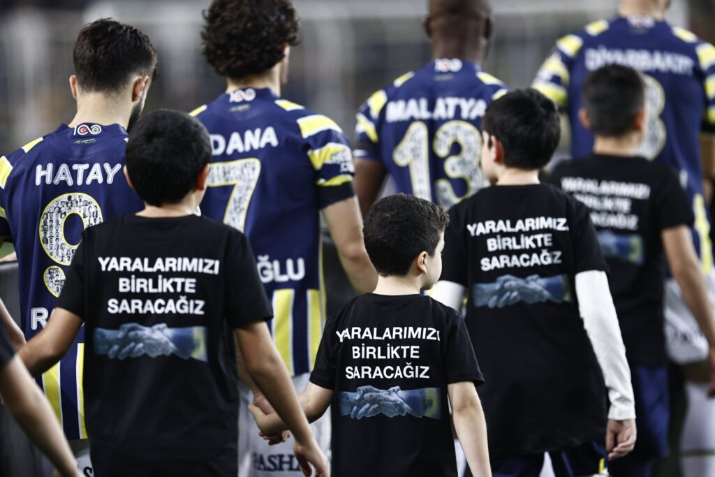 Müsabaka öncesinde iki takım da sahaya siyah tişörtlerle çıkarken, Fenerbahçeli oyuncuların tişörtleri üstünde “Yaralarımızı Birlikte Saracağız” ve “Geçmiş Olsun Türkiyem” ifadeleri yer aldı.