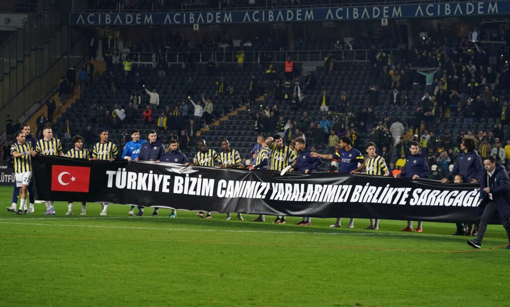 Öte yandan “Yaraları Birlikte Saracağız”, “Bizim Canımız Türkiye” ve “Ülkemizin Başı Sağ Olsun, Hepimize Geçmiş Olsun” ifadeleri kullanıldı. Tribünelerde ise “Acımız Tarifsiz, Başımız Sağ Olsun” pankartı açıldı.
