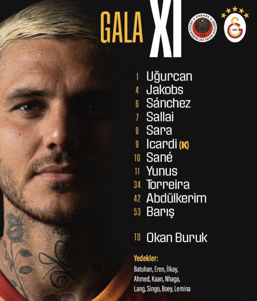 Galatasaray’da hafta içi antrenmanlarda takımla çalışan Viktor Osimhen ve sakatlığı devam eden Yaser Asprilla ve kaleci Günay Güvenç, maç kadrosunda bulunmuyor.
