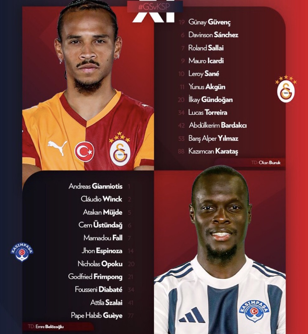 Sarı kırmızılılar da milli takımlarında bulunan İsmail Jakobs, Mario Lemina, sarı kart cezalısı Victor Osimhen, sakatlığı bulunan Wilfiried Singo, Uğurcan Çakır ve Berkan Kutlu, forma giyemeyecek.