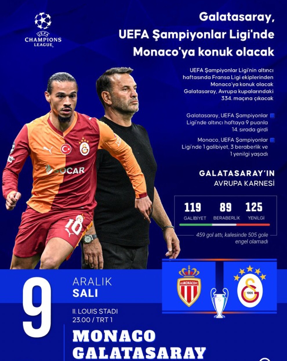 UEFA Şampiyonlar Lig 6. hafta mücadelesinde temsilcimiz Galatasaray, bu gece Fransız Monaco’ya konuk oluyor.