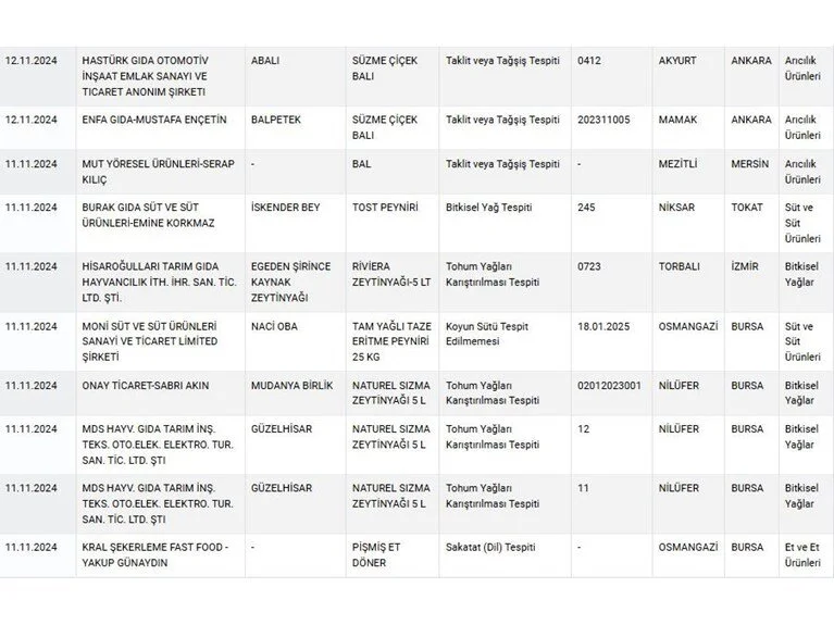 Listeye göre kıymada at ve eşek eti, dönerde dil, kaşar peynirinde bitkisel yağ tespit edildi.