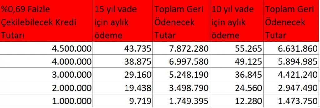 Yapılan hesaplamaya göre, yüzde 0,69 oran ve 15 yıl vade için en fazla 4 milyon 500 bin liralık kredi çekilebilecek. Bu koşullar altında vatandaşın aylık kredi ödemesi ortalama 43 bin 735 lira olacak. Söz konusu kredinin toplam geri ödemesi ise 7 milyon 872 bin liraya yakın olacak. Aynı tutarın 10 yıl vade için çekilmesi durumunda ise aylık ödemeler ortalama 55 bin 265 lirayı, toplam geri ödemesi ise 6 milyon 632 bin lirayı bulacak.