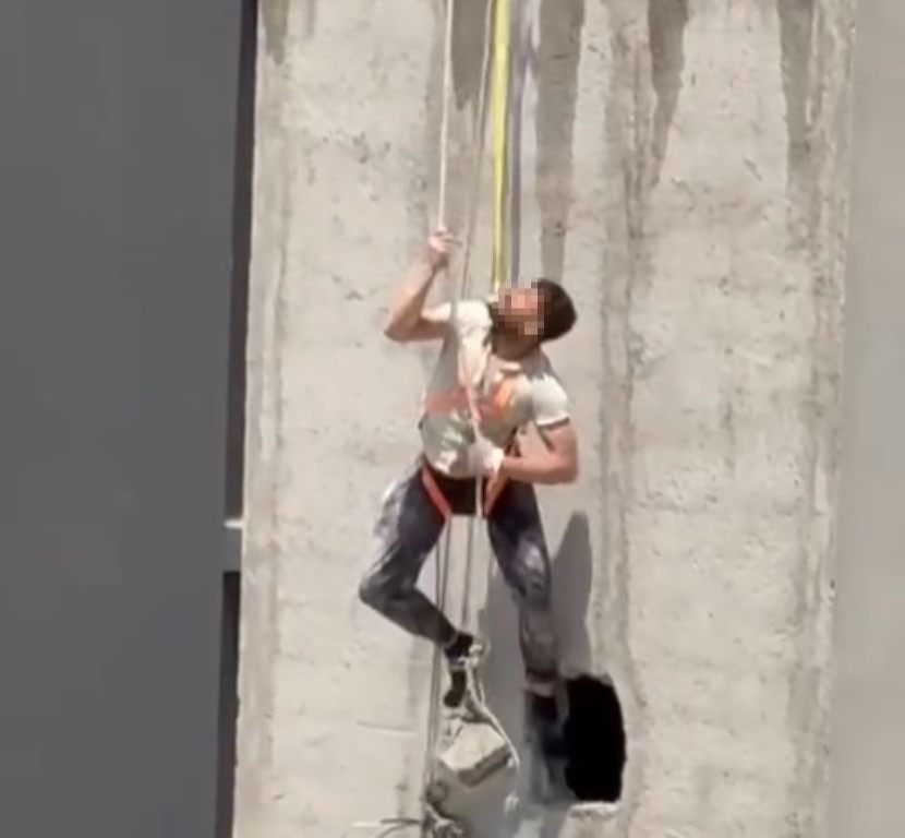 Bir süre sonra emniyet halatının ani bir gevşemesiyle işçi hızla aşağıya doğru kaydı ancak 1. kat seviyesinde tekrar durdurdu.