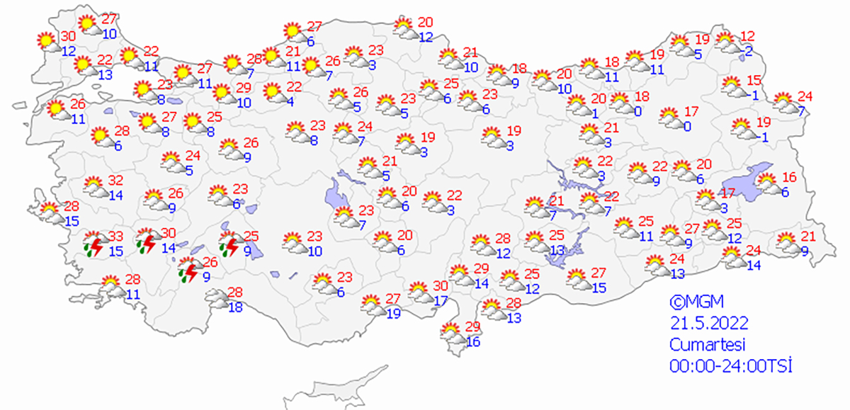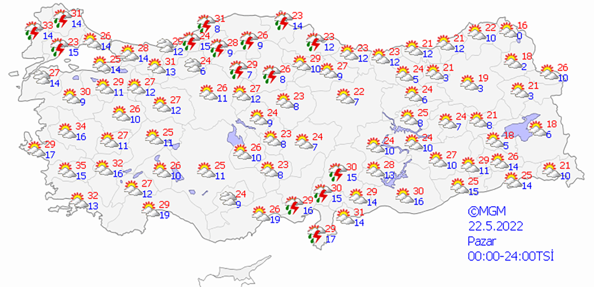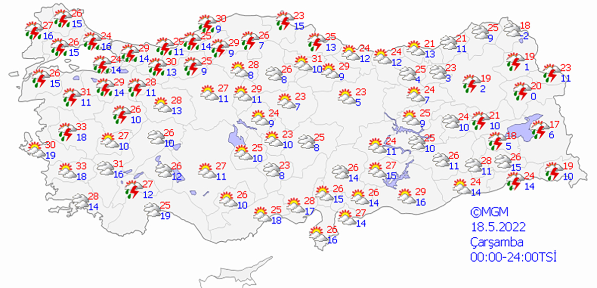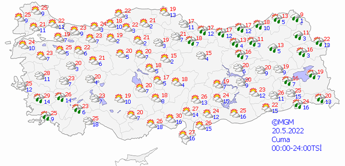 Meteoroloji Genel Müdürlüğü tarafından yapılan son değerlendirmelere göre, Yurdun kuzey, iç ve doğu kesimlerinin parçalı yer yer çok bulutlu, Marmara, Kuzey Ege, Batı Akdeniz’in iç kesimleri, Doğu Akdeniz’in Toroslar mevkii, Batı Karadeniz, Orta Karadeniz kıyıları, Doğu Anadolu’nun doğusu (Ardahan hariç) ile Ankara, Çankırı, Kırıkkale, Kırşehir, Konya, Çorum, Amasya ve Giresun çevrelerinin yerel olmak üzere Sağanak ve gök gürültülü sağanak yağışlı, diğer yerlerin parçalı ve az bulutlu geçeceği tahmin ediliyor.