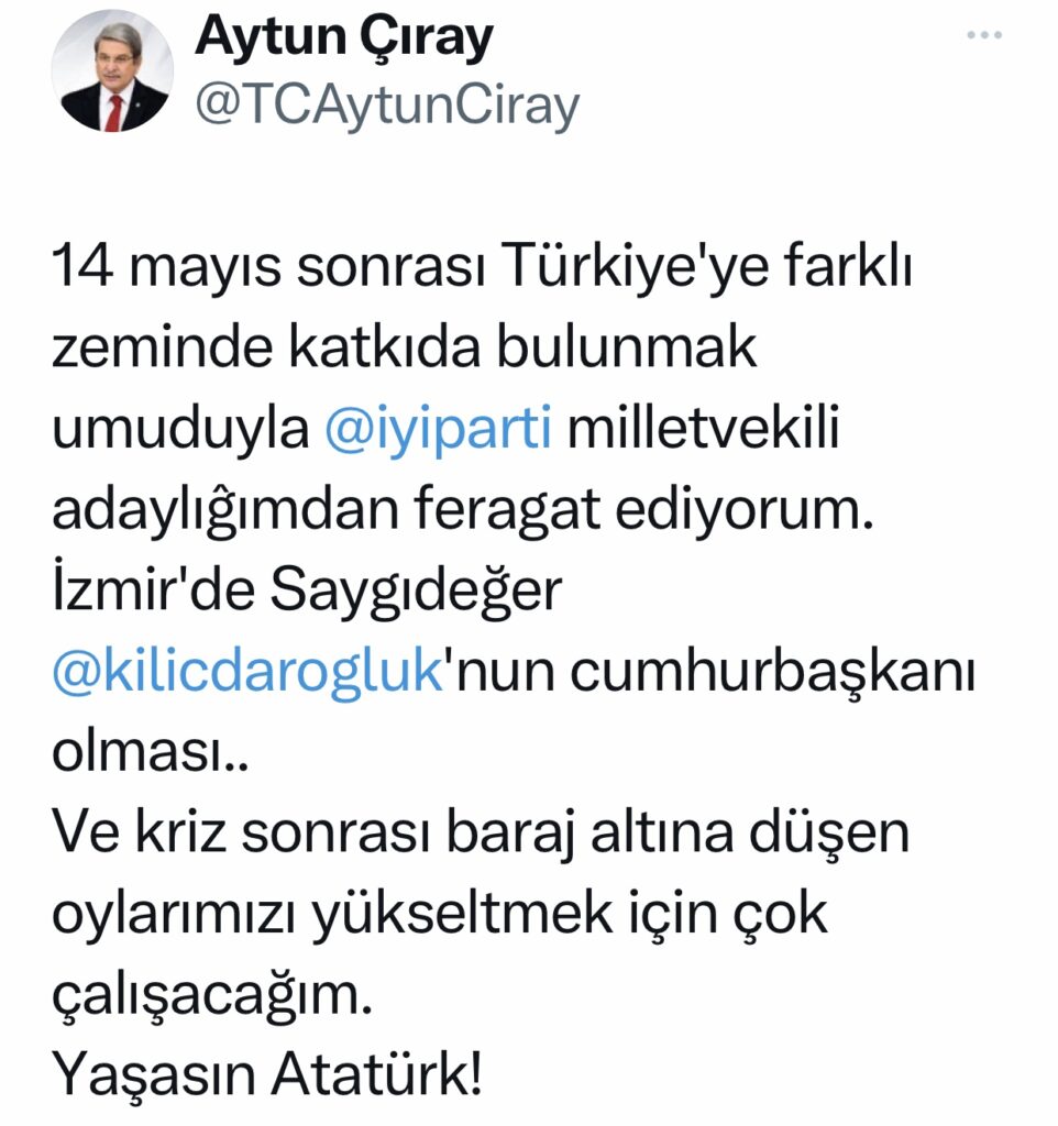 İYİ Parti İzmir Milletvekili Aytun Çıray’ın Twitter hesabından yaptığı paylaşım, kafaları karıştırdı.