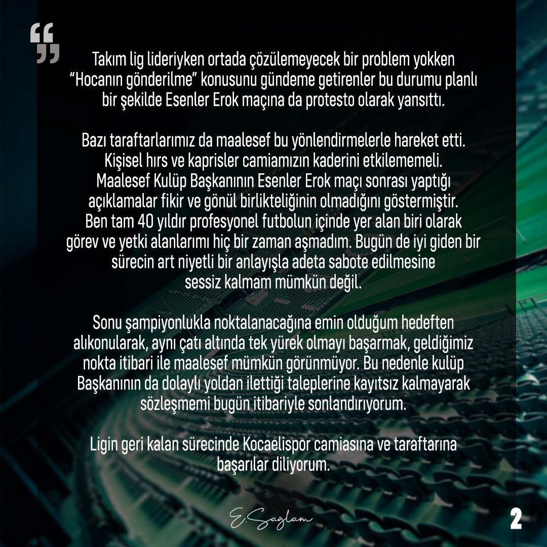 Yönetimle anlaşmazlık yaşayan Sağlam, “saha dışı yaşanan olaylar son derece üzücüdür.” diyerek yaptığı açıklama şöyle: