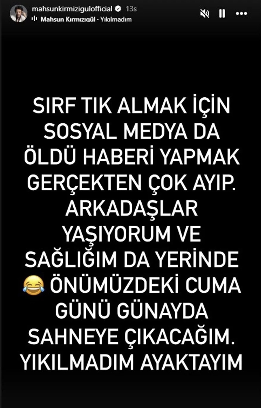 Mahsun Kırmızıgül “öldü” haberlerini, sosyal medya hesabında yaptığı paylaşımla yalanladı: “Sırf tık almak için sosyal medyada ‘öldü’ haberi yapmak gerçekten çok ayıp. Arkadaşlar, yaşıyorum ve sağlığım da yerinde. Önümüzdeki cuma günü sahneye çıkacağım. Yıkılmadım, ayaktayım” mesajını paylaştı.