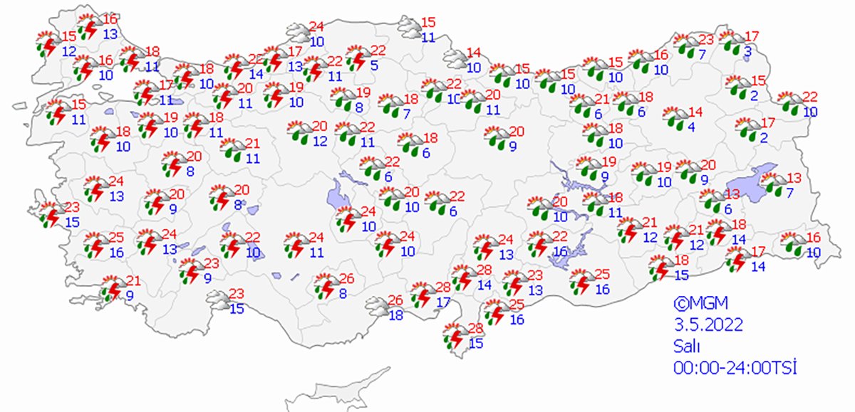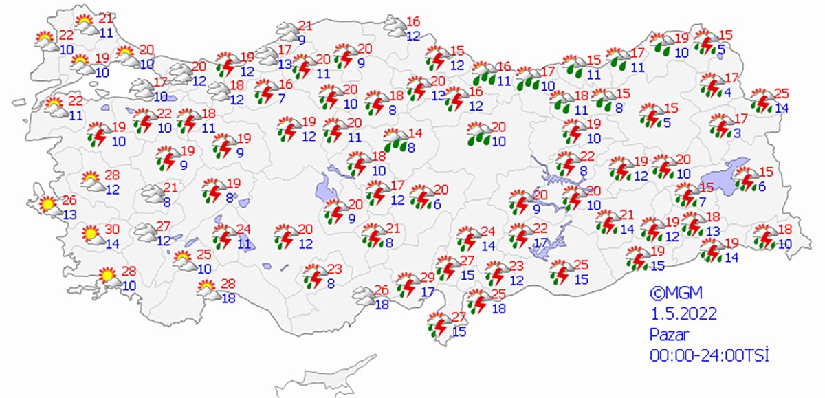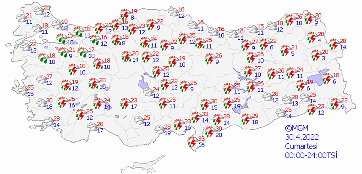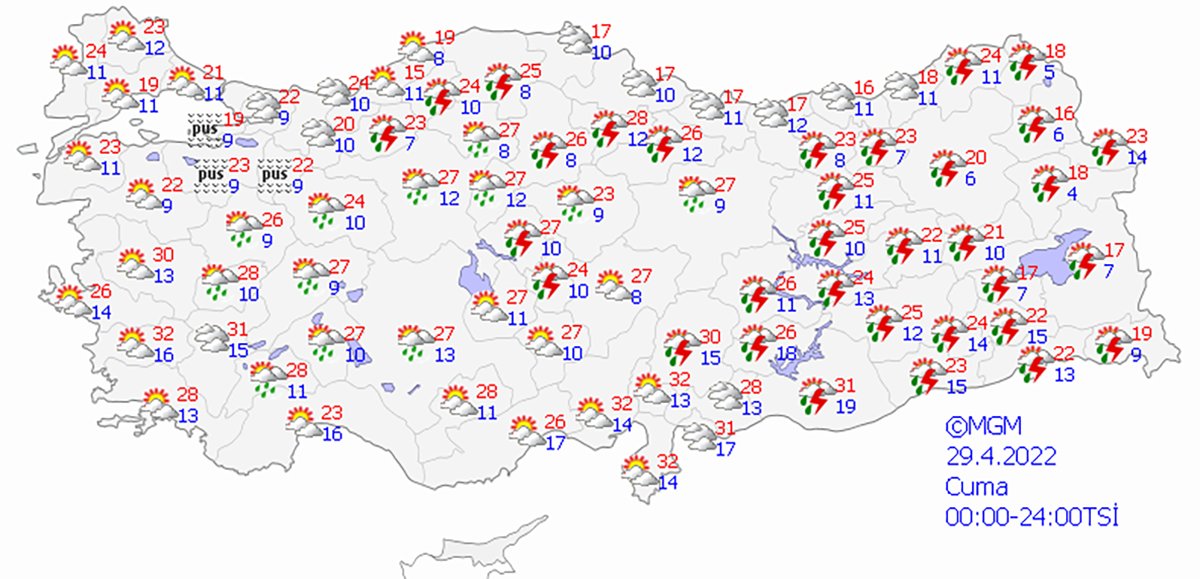 Meteoroloji Genel Müdürlüğü tarafından yapılan son değerlendirmelere göre: Ülkemiz genelinin parçalı ve çok bulutlu, Göller Yöresi, İç Anadolu’nun kuzeyi, Karadeniz’in iç kesimleri, Doğu ve Güneydoğu Anadolu (G. Antep ve Kilis hariç) ile Kütahya, Uşak, Afyonkarahisar ve Konya çevrelerinin yerel olmak üzere sağanak ve gök gürültülü sağanak yağışlı geçeceği tahmin ediliyor. Bu gece ve yarın sabah saatlerinde Marmara’nın güneyi, Karadeniz ile Doğu Anadolu’nun doğusunda yer yer pus ve sis bekleniyor. Güneydoğu Anadolu’nun güney kesimlerinde toz taşınımı beklenmektedir.