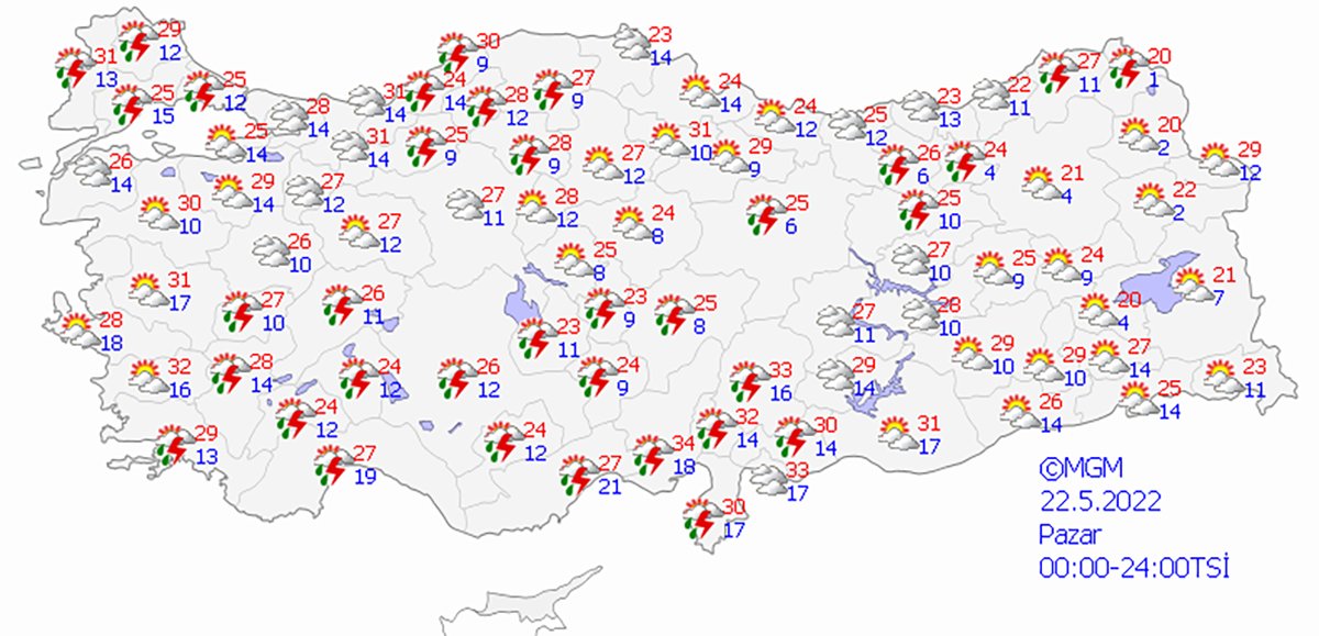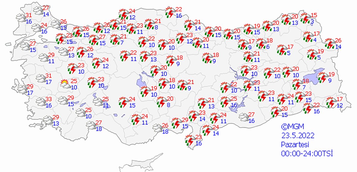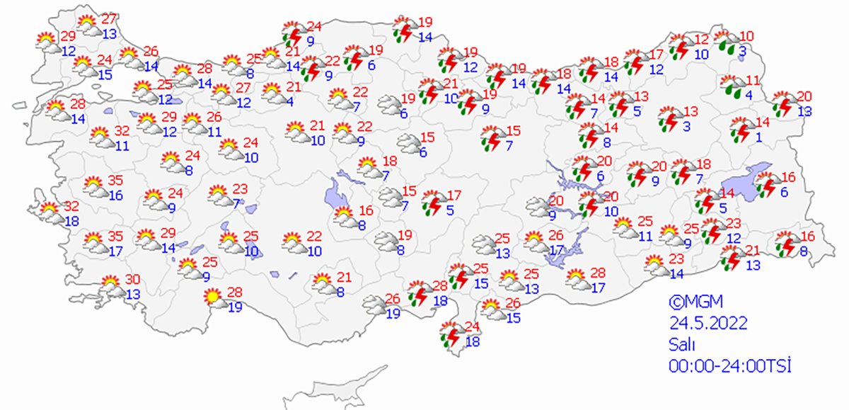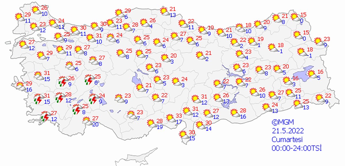 “Ülkemizin doğusu ile güneybatı kesimlerinin parçalı ve çok bulutlu, Doğu Karadeniz, Doğu Anadolu’nun doğusu, Muğla, Ordu ve Erzincan çevreleri, Aydın, Denizli ve Burdur’un güneyi, Antalya’nın batı ilçeleri ile Samsun ve Tokat’ın doğusunun yerel olmak üzere sağanak ve gök gürültülü sağanak yağışlı, diğer yerlerin az bulutlu ve açık geçeceği tahmin ediliyor. Rüzgarın Marmara’nın güneyi, Kıyı Ege, Doğu Akdeniz’in iç kesimler Doğu Anadolu’nun batısında kuzeyli, Doğu Anadolu’nun doğusunda güneybatı yönlerden kuvvetli (40-60 km / saat) olarak esmesi beklenmektedir.”
