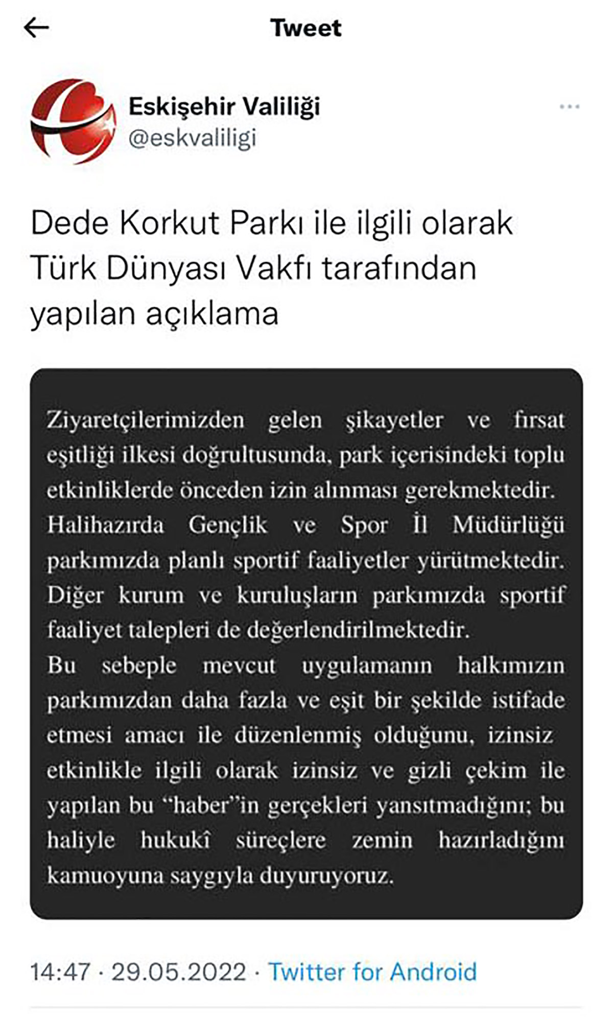 “Ziyaretçilerimizden gelen şikayetler ve fırsat eşitliği ilkesi doğrultusunda, park içerisindeki toplu etkinliklerde önceden izin alınması gerekmektedir. Halihazırda Gençlik ve Spor İl Müdürlüğü, parkımızda planlı sportif faaliyetler yürütmektedir. Diğer kurum ve kuruluşların parkımızda sportif faaliyet talepleri de değerlendirilmektedir. Bu sebeple mevcut uygulamanın halkımızın parkımızdan daha fazla ve eşit bir şekilde istifade etmesi amacı ile düzenlenmiş olduğunu izinsiz etkinlikle ilgili olarak izinsiz ve gizli çekim ile yapılan bu ‘haber’in gerçekleri yansıtmadığını bu haliyle hukuki süreçlere zemin hazırladığını kamuoyuna saygıyla duyuruyoruz.” Bu arada Eskişehir Valiliği sosyal medya hesabından da Türk Dünyası Vakfı’nın konuyla ilgili açıklaması paylaşıldı.