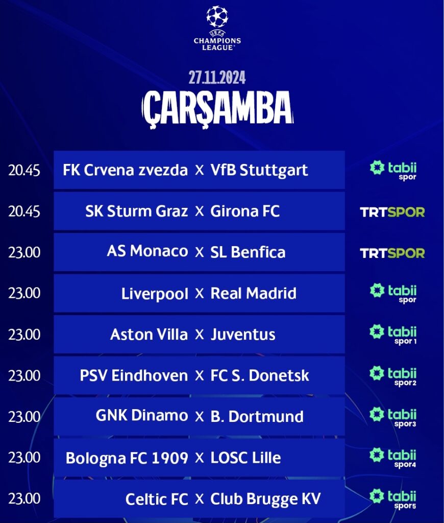 UEFA Şampiyonlar Ligi’nin 5. haftası 2. gününde (27 Kasım Perşembe) bu gece 9 karşılaşma oynanacak ve 5. hafta tamamlanacak.