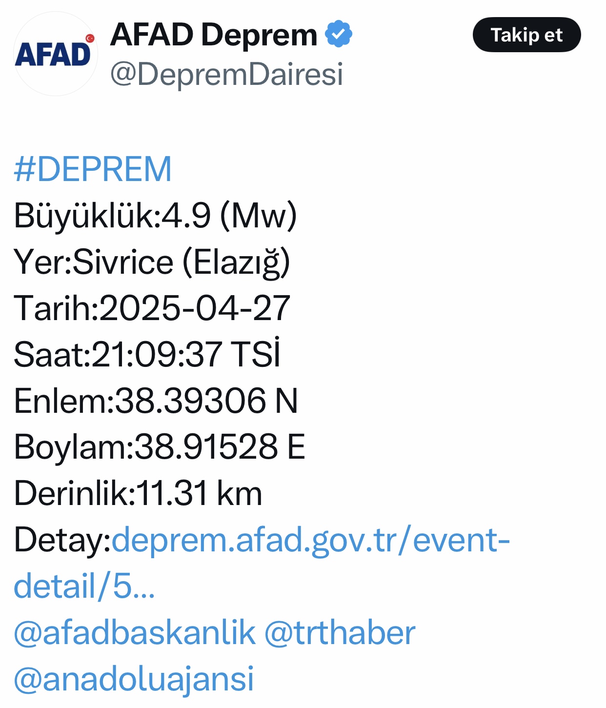 Son Dakika | Elazığ Sivrice merkezli 4.9 şiddetinde deprem meydana geldi.