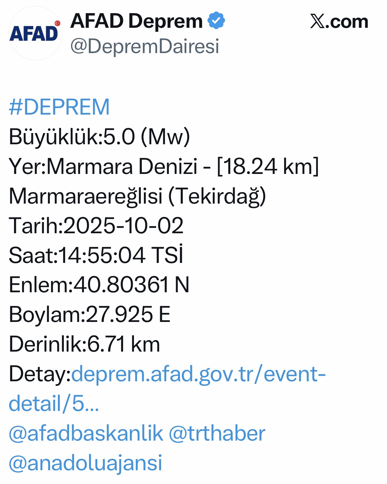 Son Dakika | AFAD’ın açıklamasına göre Tekirdağ Marmaraereğlisi’nde saat 14:55’de 5,0 ölçeğinde bir deprem meydana geldi.