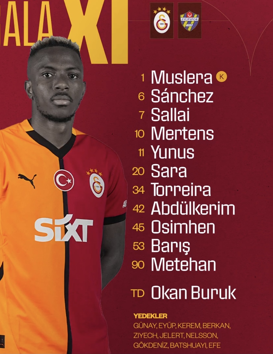 Karşılaşma öncesi Galatasaray 34 puanla lider durumda bulunurken, Süper Lig’in yeni ekibi Eyüpspor’un ise 22 puanı var.