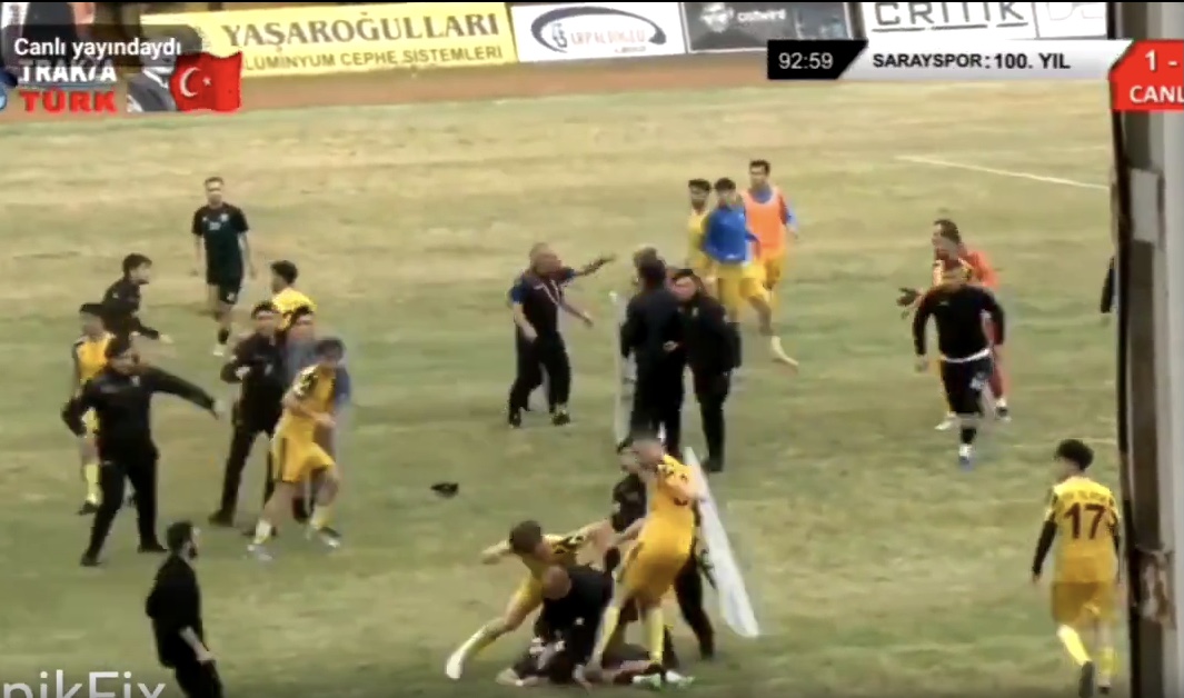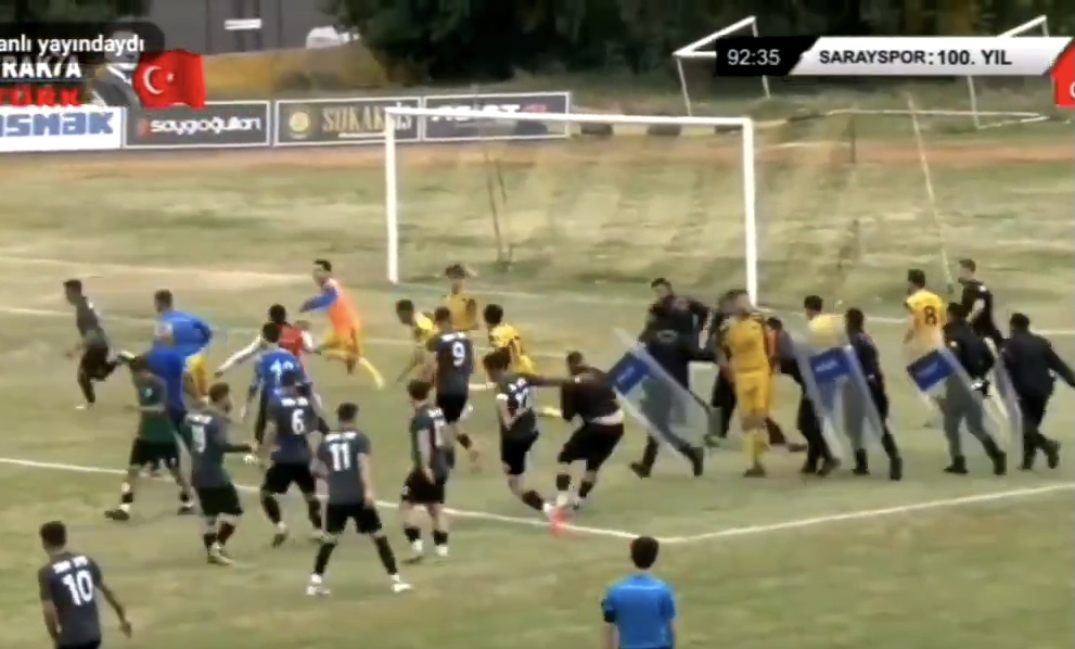 Güvenlik güçleri sahaya girip kavgayı ayırmakta güçlük çekti.