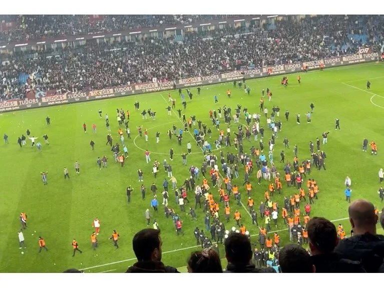 Karşılaşma sonrası yüzlerce Trabzonspor taraftarı sahaya girdi ve Fenerbahçeli futbolculara saldırıp darp etti.