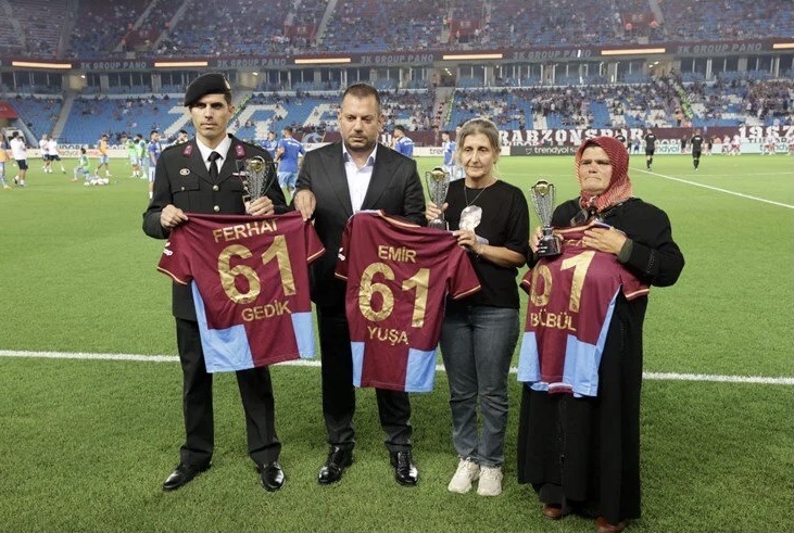 Trabzon’un Maçka ilçesi kırsalında 11 Ağustos 2017’de PKK’lı teröristlerle sıcak temas sırasında şehit olan 15 yaşındaki Eren Bülbül’ün annesi Ayşe Bülbül ile kıdemli Başçavuş Ferhat Gedik’in adına Akçaabat İlçe Jandarma Komutanı Yüzbaşı Barış Kesici’ye saha kenarında Trabzonspor forması ve şampiyonluk kupası minyatürü hediye etti.