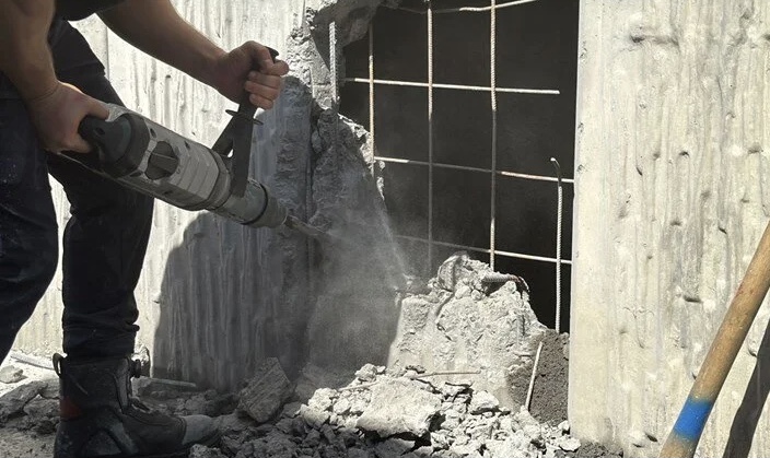 Kişinin bulunduğu yerden çıkarılması için itfaiye ekipleri, darbeli matkapla duvarı delmeye başladı.