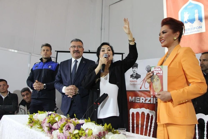 Türk sinemasının 77 yaşındaki usta oyuncusu Türkan Şoray, Amasya’nın Merzifon ilçesinde düzenlenen 6. Merzifon Kitap Fuarı’nın açılışında buluştuğu hayranlarına şarkı okudu.