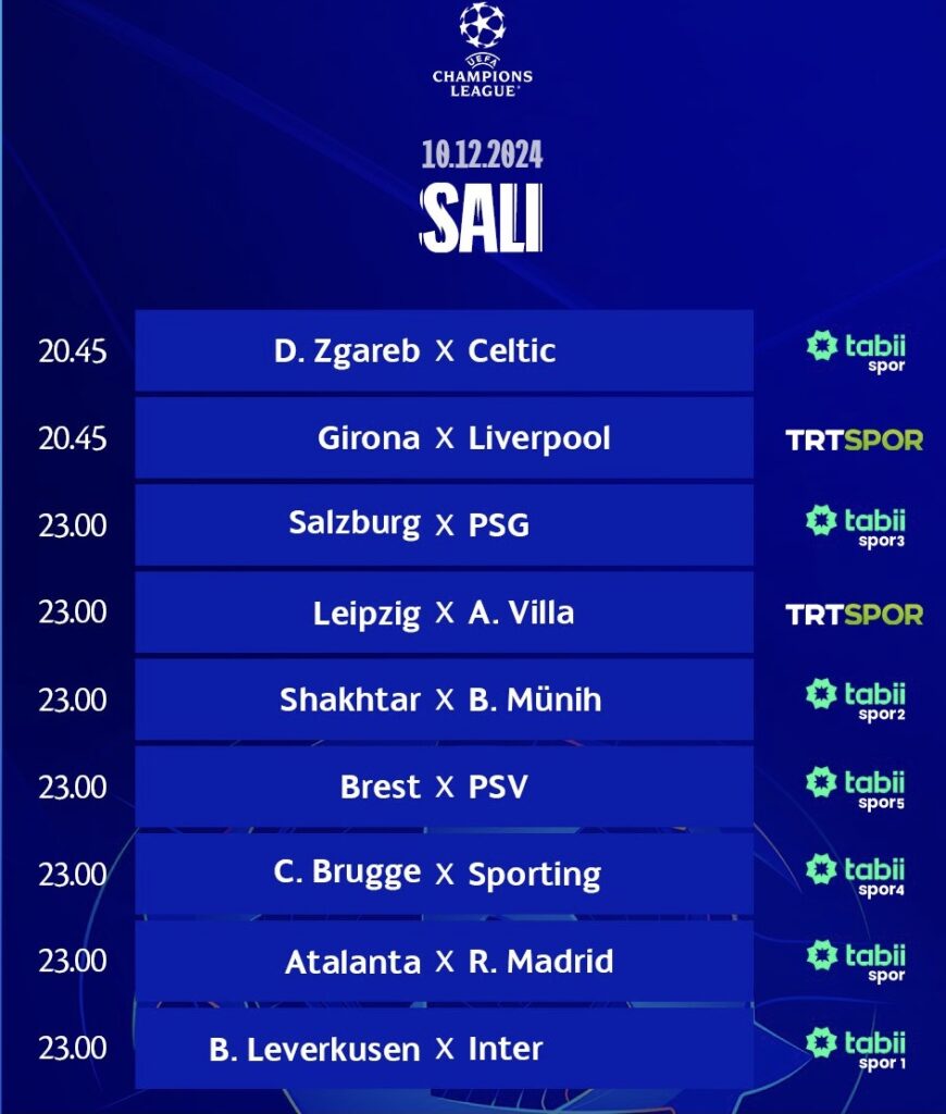 Haftanın açılışı Dinamo Zagreb – Celtic ve Girona – Liverpool arasında 20:45’de oynanacak maçlarla başlayacak.