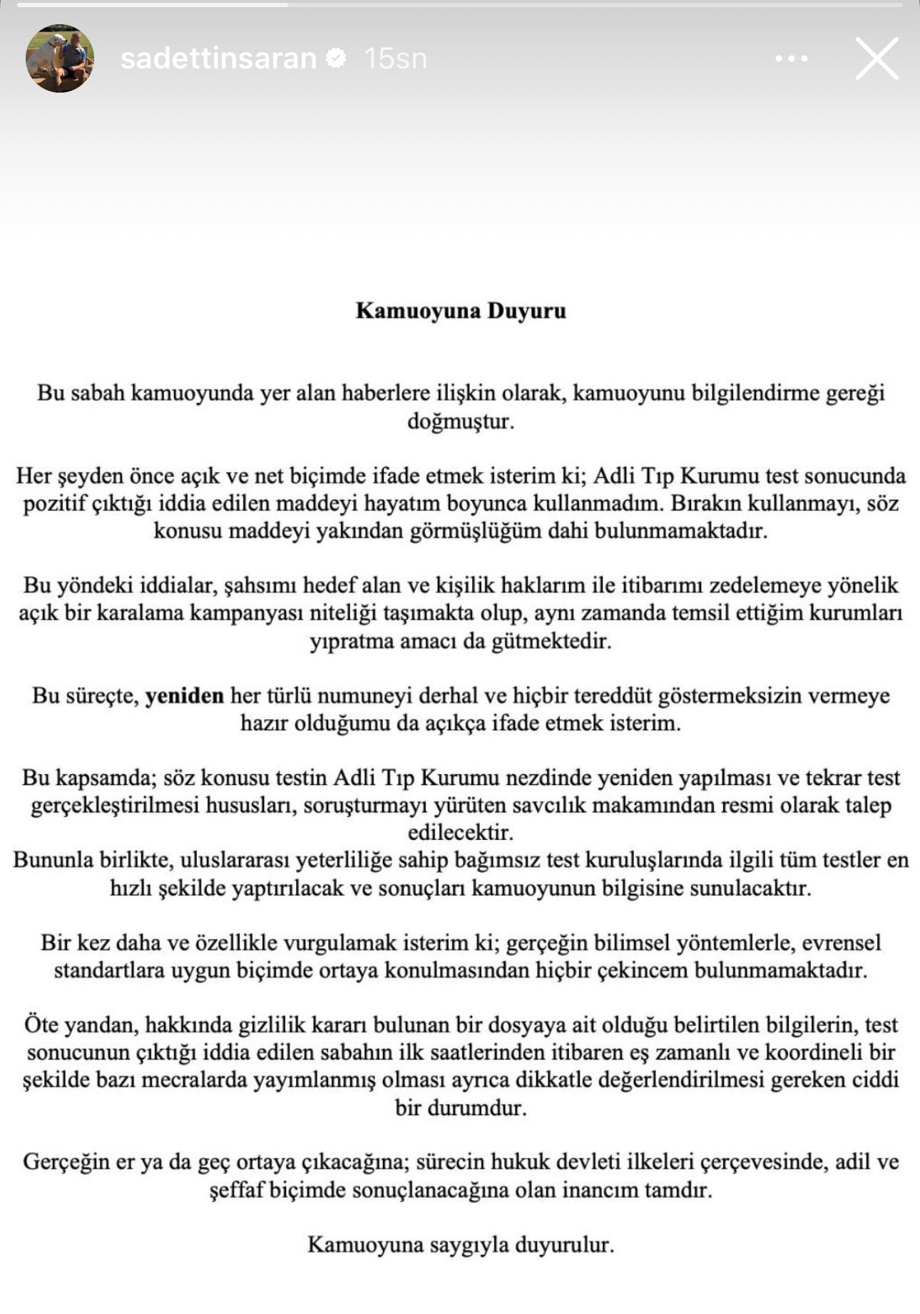 Saran yaptığı açıklamada, Adli Tıp Kurumu testinde pozitif çıktığı iddia edilen maddeyi hayatı boyunca kullanmadığını, yeniden test verilmesine hazır olduğunu ve bağımsız laboratuvarlarda da test yaptıracağını belirtti.👇