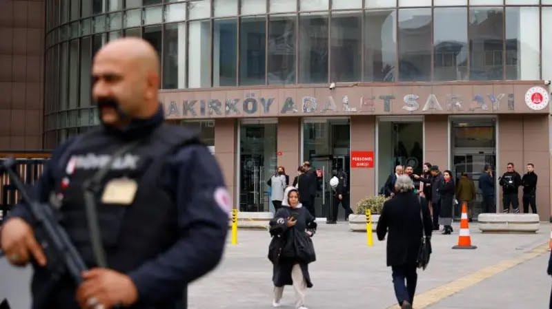 Bakırköy Adliyesi’nde, 21. Ağır Ceza Mahkemesi Salonu’nun kapasitesinin yetersiz olması sebebiyle geniş güvenlik önlemleri arasında konferans salonunda görülüyor.