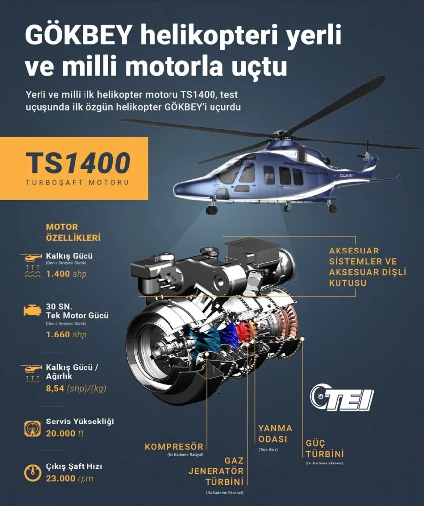Demir, paylaşımında “Türk savunma sanayiinde önemli bir kilometre taşı. Yerli ve milli ilk helikopter motorumuz TS1400, test uçuşunda ilk özgün helikopterimiz GÖKBEY’i uçurdu. Mühendislerimizin ellerine sağlık.” ifadesini kullandı.